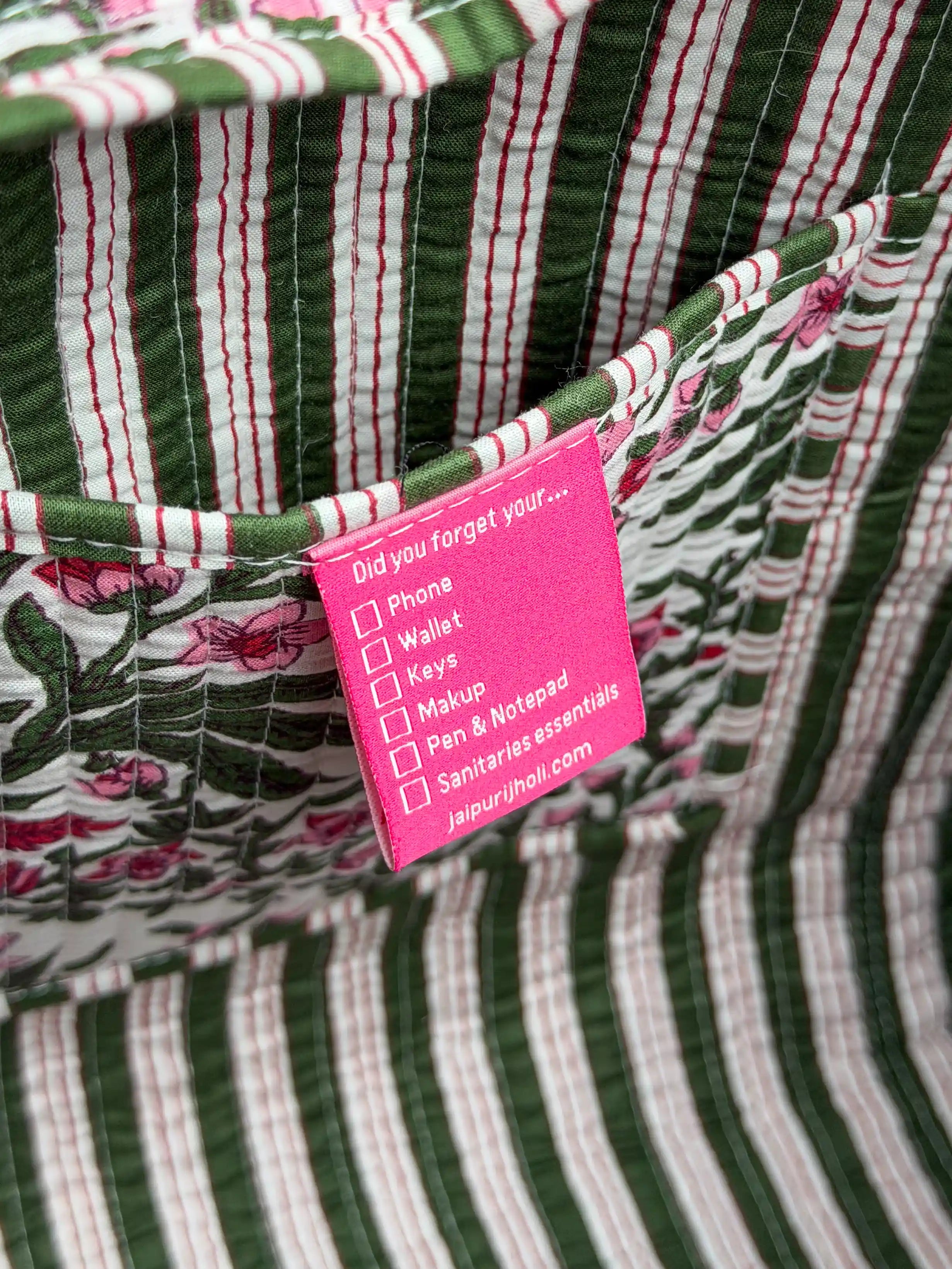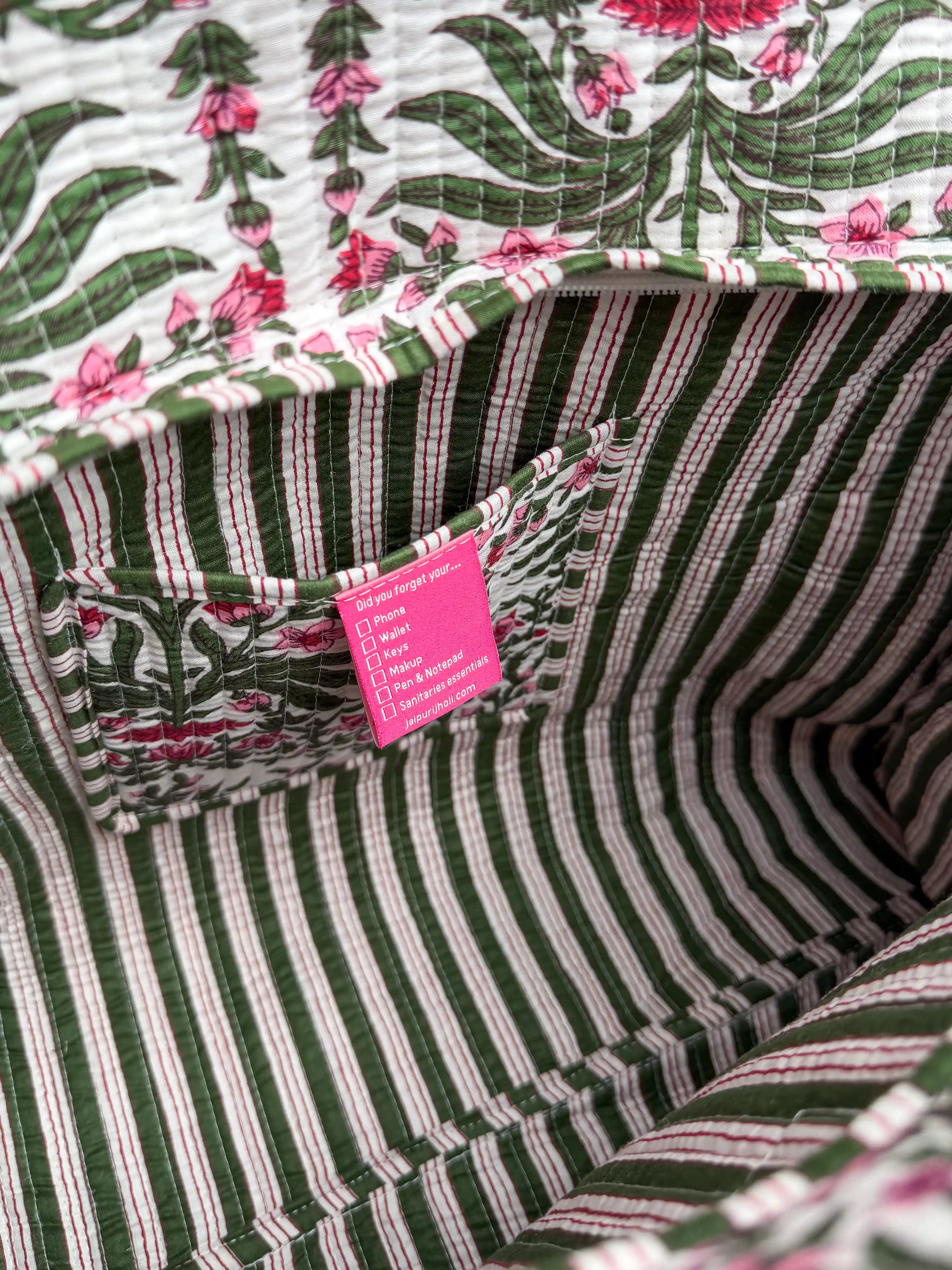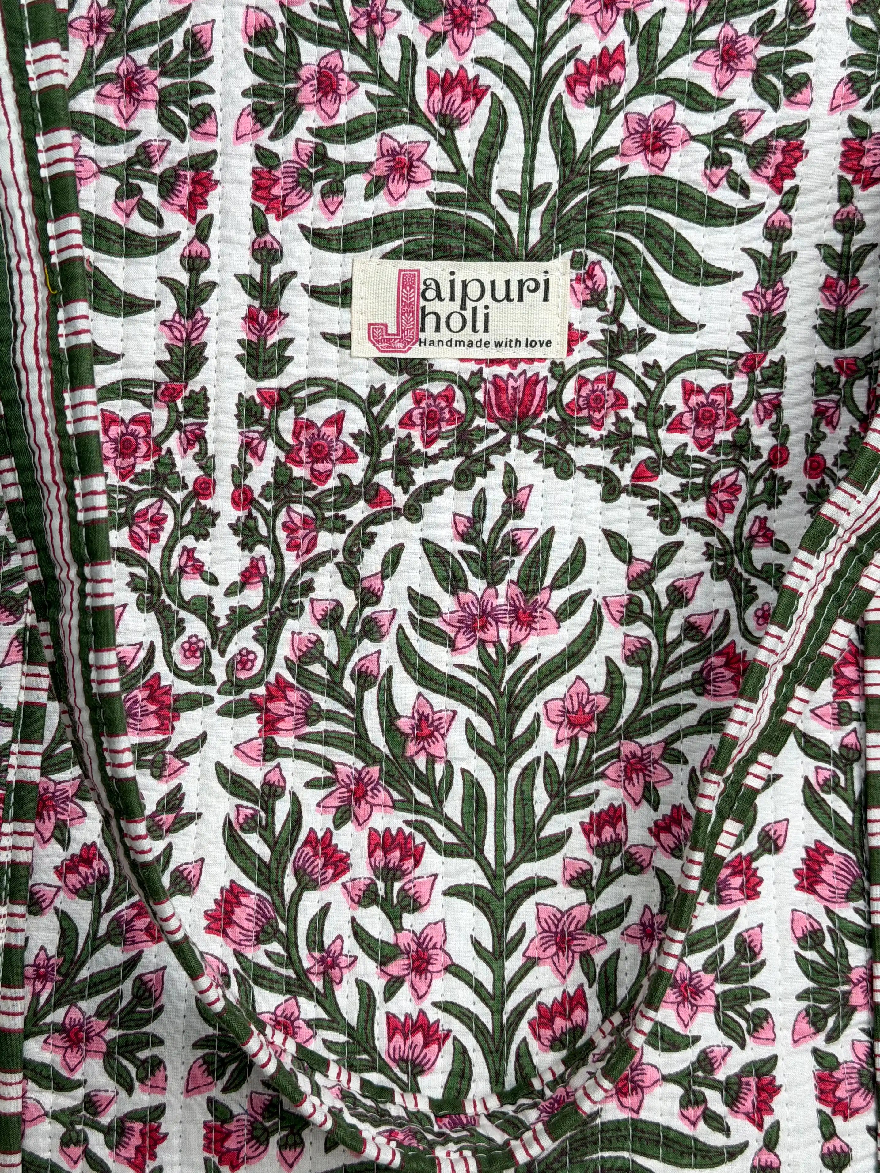 Carry your essentials in style with our White Garden Whisper Quilted Tote Bag. Made from soft premium cotton with traditional Jaipuri hand block prints, this tote is lightweight, spacious, and perfect for daily use or travel. Its strong straps and zip closure make it both beautiful and practical.